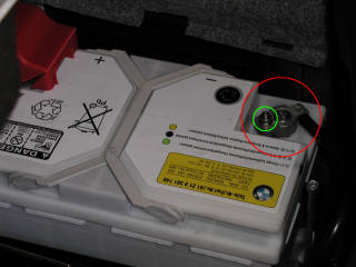 nut (green circle, 10mm wrench/socket) and pull the connector off the